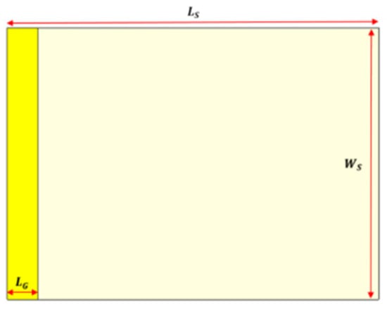 The initial tuning operations are obtained using the common width dipole elements such that the variable width dipole antenna acts as a single thin dipole antenna. The common width dipole resonates at a frequency of 1.8 GHz and is in good agreement with the second resonance frequency, as per the theoretical calculations of Equation (9). The scatter plot obtained for the same is illustrated in Figure 8 as case 1. The resonance and bandwidth can be controlled further according to the equivalent length and width combination of the five element dipoles. The 350 MHz bandwidth obtained in case 1 is escalated in case 2 by increasing the elements widths and slightly decreasing the length to incorporate the high frequencies. However, the 420 MHz bandwidth obtained in case 2 is not sufficient to include the middle and high bands. Thus, the length and width of the dipole elements are further optimized to include the higher frequency bands. Case 3 resonates for two frequencies; the lower resonating frequency of 1.8 GHz is due to the total equivalent length and the higher resonating frequency of 2.3 GHz is supported by the sub-combinations of dipole element lengths. The total bandwidth achieved in case 3 is 800 MHz, in comparison to 420 MHz obtained in case 2. However, all three cases are not able to cover the high frequency bands. It should be noted that there is a small gap between the middle and high frequency bands. The same process was attempted to be incorporated in case 4, by emphasizing dipole element 4, which nearly covers low frequency and high frequency bands with bandwidths of 270 and 850 MHz, respectively. The essential operational bandwidth can be achieved in the same escalating manner but will result in a bulky antenna. The basic compact size requirement of the radio device is obtained by folding the elements of the dipole in the minimum possible substrate space with a cross-section area of 35 × 48 mm2, as illustrated in Figure 9. However, the size minimization may result in bandwidth depletion because of the finite, rather than infinite, ground, and this can be addressed by a defective ground structure with an optimized length of 4 mm, as shown in Figure 10. The length and width of the feeding element are optimized to 5.6 and 10 mm, respectively.