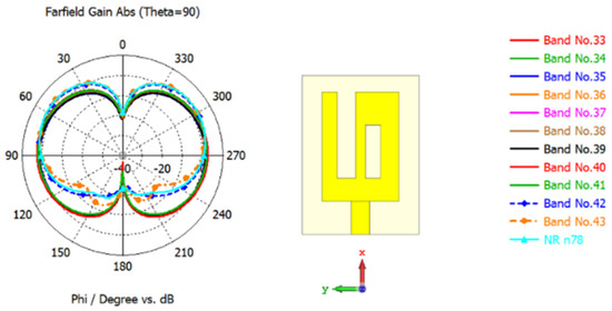 Table 3 provides a comparison of the designed antenna with different reported designs in terms of size and bands. The designs presented in [8,9] resonate only on a single LTE band, and those of [10,12,15,30] working on the multi-band but not on all of the bands. In comparison, the antenna designs reported in [13,14,17] are capable of operating on most of the LTE bands. By comparison, those in [31,32,33,34,35] are capable of working in 5G NR sub-6 GHz bands in addition to some LTE bands, but are bulky and non-planar in structure. Many of the designs available in the literature considered the infinite ground or active switches for their operations. The folded dipole designed in this research is planar, compact and simple in structure, and resonates for 5G, 4G and IoT bands with sufficient radiation characteristics, bandwidth, gain and return loss. A 97% size reduction was achieved by folding the dipoles in comparison to [31], 96% in comparison to [32], 33% in comparison to [33], 95% in comparison to [34] and 96% in compassion to [35].