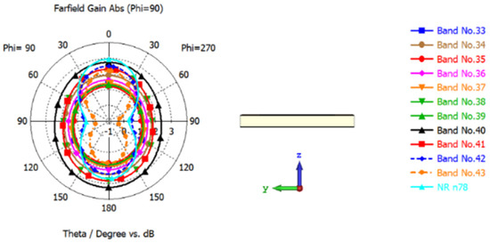 Figure 11 and Figure 12 represent the radiation pattern for all the covered bands in XY and YZ planes. A figure-of-eight pattern is observed in the azimuth plane for low and middle frequencies, whereas the pattern approximates the figure-of-eight shape in high frequencies with less emission below the y axis. Thus, the ground plane contributes to radiation in the low and middle frequency bands and acts as a reflector for high frequency bands. By comparison, omnidirectional radiations are observed in the polar plane. The ground is observed to be a reflector at low wavelength and a radiator at high wavelength, which results in less radiation at 90 polar for increasing frequencies. Therefore, the antenna approximately radiates in a doughnut pattern.