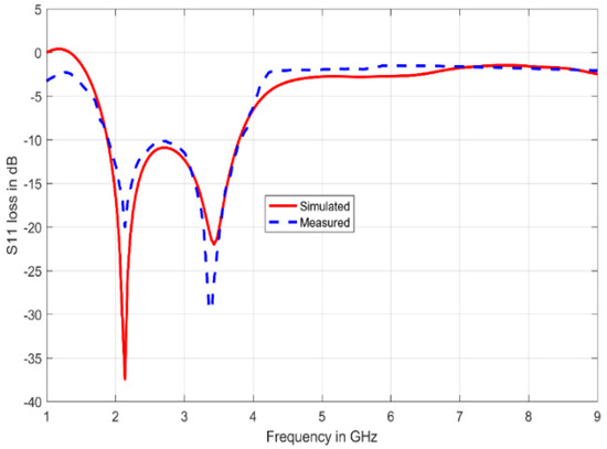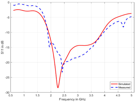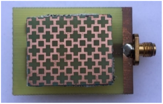 The prototype was fabricated and tested to validate the performance of the antenna, and the photograph of the fabricated prototype is shown in Figure 13. Experimental results of the designed antenna were measured using Anritsu Vector Network Analyzer (VNA), model no. MS46322A. The measured and simulated S11 parameters of the fabricated antenna are illustrated in Figure 14. A good approximation between simulated and measured results was obtained.