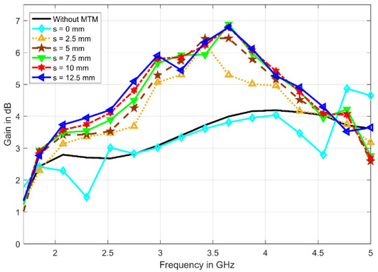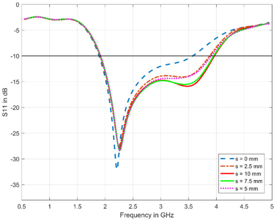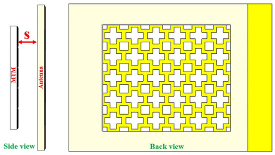 This section analyzes and evaluates the antenna performance with the designed CMC dual negative metamaterial. A metamaterial array of 6 × 5 unit cell elements was chosen for suitable coverage of the radiating element. The metamaterial is placed below the antenna and is separated by a small air gap(s) from the antenna plane, as illustrated in Figure 15. The scattering loss plot for different air gaps is illustrated in Figure 16.