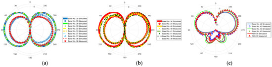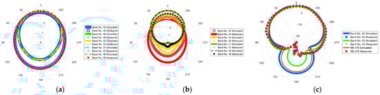 Metamaterial integrated antenna radiation pattern in the polar plane. (a) Low frequency bands. (b) Middle frequency bands. (c) High frequency bands.