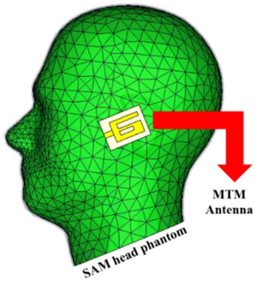 where E is the induced electric field, is the conductivity of tissue and is the tissue density. There are various factors affecting the value, such as the tissue properties, geometry and spacing from the antenna. The simulation was examined using the CST SAM (Specific Anthropomorphic Mannequin) head phantom, because the antenna is designed for mobile applications and the head is the most exposed part in mobile radiation. The SAM consists of a plastic shell filled with tissue simulating liquid, and was defined for standardized certification purposes based on the 90th percentile of the head size of the male population [38]. The designed antenna is placed near to the left ear at a distance of d; the simulation setup for SAR analysis is illustrated in Figure 22.