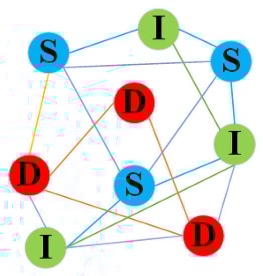 Schematic diagram of a heterogeneous combat network. Node S denotes the sensor entity, node D denotes the decision entity, and node I denotes the influence entity.