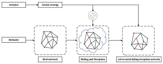 As shown in Figure 3, we set the real operational network of the defender, denoted as . Under the incomplete information condition, the attacker cannot reconnoiter the complete network information. Its reconnoitred network is the adversarial hiding deception network deployed by the defender, denoted as . The attack strategy of the attacker is denoted as A. Our objective is to solve the adversarial hiding deception network , deployed by the defender based on the real operational network.