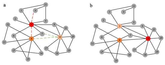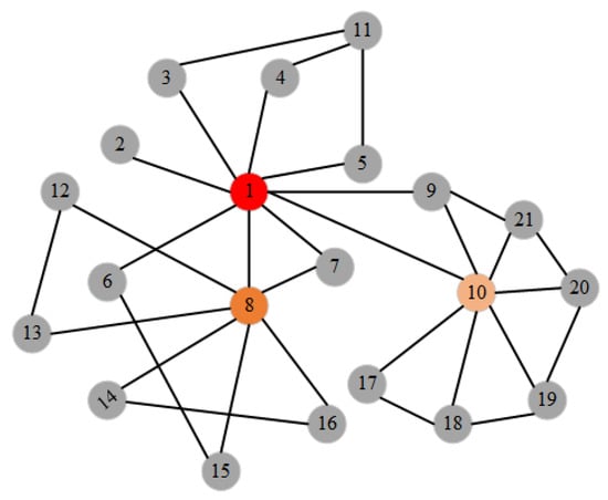 The following is an example to demonstrate the adversarial hiding deception strategy in a communication network, where the nodes of the communication network are communication base stations and user terminals, and the connected edges are the wireless communication relationships between individual communication base stations, between communication base stations and users, and between users. Because the real communication network is too complex, each node is distributed in various locations in the city, and the wireless communication relationship between nodes is difficult to get through detection. So the attacker cannot obtain the real network topology directly, and the defender can easily construct an adversarial hiding deception network by setting hidden edges and deceptive edges. The attacker obtains the wireless communication relationship between the nodes by detecting the communication frequency and communication strength and then obtains the observed communication network. The defender’s hidden edge setting is implemented by decreasing the communication frequency and communication strength between nodes. The deceptive edge setting is implemented by increasing the communication frequency and communication strength between nodes. The following is a network example to demonstrate the construction process of the adversarial hiding deception network and its effectiveness. Suppose the original network consists of 21 nodes and 33 edges, that is, , , as shown in Figure 4. The three nodes with the highest degree are node 1, node 8, and node 10, and their degree values are , , and , respectively, and each of the three nodes are colored, and the higher the degree, the darker the color.
