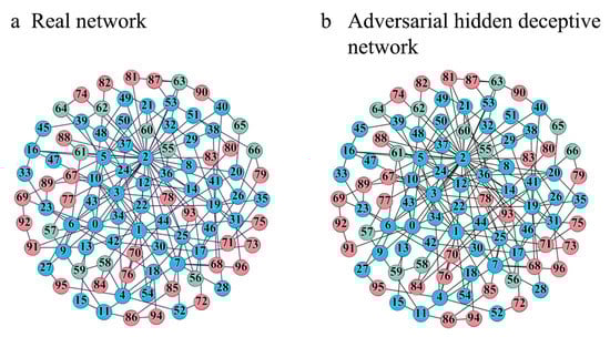 Real network and adversarial hiding deception network. (a) is the real network, (b) is the adversarial hiding deception network.