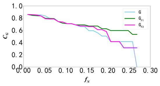 Figure 7a shows the real network and Figure 5b shows the adversarial hiding deception network generated using AHDNG. The basic topological characteristics of the network are shown in Table 2. First, the attacker uses HDA to disintegrate the original network and the adversarial hiding deception network, respectively, and the obtained sequence of disintegrate nodes and . Second, the combat capability indices and are calculated separately for disintegrating the original network using the sequence of disintegrating nodes and ; the results are shown in Figure 8. Figure 8 shows the process of HDA disintegrating the original network using the sequence of attack nodes and , respectively, from which we can see that, in the initial stage of disintegrating, the operational capability of the real network before and after defense is basically the same. When the attack strength is greater than 0.15, the nodes with high importance ranking in the undefended real network are dismantled first. In contrast, the real network defended by adversarial hiding deception induces the attacker to disintegrate the real nodes with low importance ranking in the network. When the attack strength is greater than 0.25, the operational capability of the undefended real network is already 0. In contrast, the real network defended by adversarial hiding deception still has multiple complete operational chains and maintains an operational capability of about 0.56. Table 3 shows the node sequence comparison of the attacker’s disintegration of the original network before and after the defense. Combined with Figure 7, we can see that the disintegration node sequence changes from to , and the attacker’s sequence of nodes that disintegrate the original network is successfully induced.