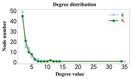where denotes the minimum degree of nodes in the network G, is the set of node degrees, and is the total number of nodes. Figure 8 shows the degree distribution of the real network and the adversarial hiding deception network. From Figure 10, we can visualize that the degree distributions of the two networks are consistent.
