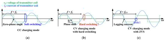 Ideal voltage and current of transmitter coil in (a) constant current charging mode without phase shift control at f = fo; (b) constant voltage charging mode at f = fo with phase shift control; (c) constant voltage charging mode without phase shift control at f = fCV.
