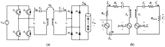 where the subscripts p and s stand for the primary and secondary, Vbat is the voltage of the battery pack and Ibat is the charging current of the battery pack. Then, an equivalent of the proposed circuit is shown in Figure 3b, where Rin, Rp and Rs are equivalent series resistance (ESR) of full bridge inverter, primary coil and secondary coil, respectively. Rbat,eq is the equivalent load resistance of the battery pack, which can be expressed as: