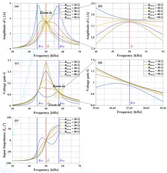 where Zp and Zs are impedance of the transmitter and receiver coil as Zp = Rp + jωLp + 1/jωCp and Zs = Rs + jωLs + 1/jωCs. From (6) and (7), amplitude of is, Is (Figure 5a), voltage conversion ratio G (Figure 5c), and input impedance Zin (Figure 5e) of the proposed circuit can be expressed as: