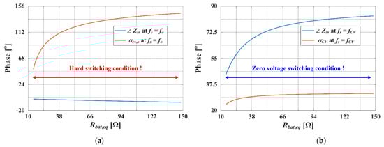 where Vcv is the value of CV. However, αcv,o is proportional to Rbat,eq, and it generates a hard switching condition because αcv,o is larger than ∠Zin at fs = fo (Figure 2b and Figure 6a).