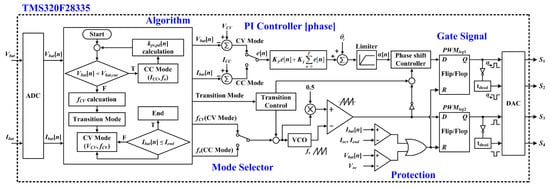 Finally, the controller for the proposed single-stage wireless battery charging circuit can be designed as in Figure 7, and it consists of an operating algorithm with kps prediction, PI control part for the αCC and αCV, CC and CV mode selector part, gate signal conditioning part and protection part for over-charging the voltage/current (Voc, Ioc). The main controller is implemented by TMS320F28335, which has a 12-bit analog-to-digital converter. The gate signal block is modulated by an enhanced pulse width modulator (ePWM) module, and other parts including an algorithm, PI controller, mode selector and protection are operated by the interrupt function of ADC block. The operating algorithm consists of the following eight procedures: