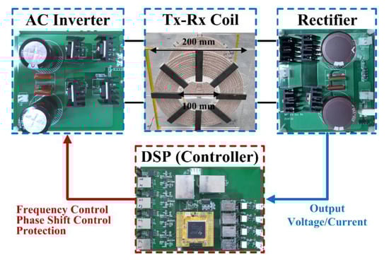 The prototype (Figure 8) was built and tested to prove the proposed single-stage wireless battery charging circuit. The battery pack was emulated by an electrical load (PLZ1004WH; Kikusui, Co., Ltd.), and the voltage range of the emulated battery pack was set to 30~42 V; 10 serially connected Li-ion battery cells. The simulated battery pack of the equivalent (Rbat) was 13.04~18.26 Ω in the CC mode having ICC = 2.3 A and 18.26~182.6 Ω in the CV mode having VCV = 42 V and Iend = 0.23 A. The inner diameter of the transmitter and receiver coil was 100 mm, the outer diameter was 200 mm, and the fo was set to 50 kHz.