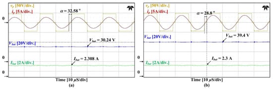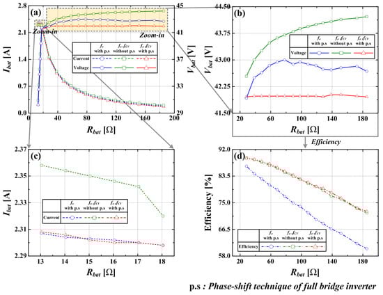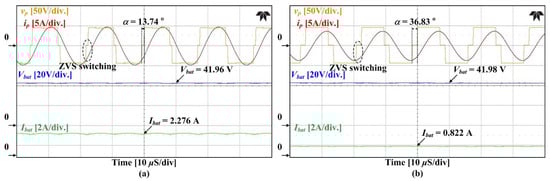 To improve the performance of the single-stage wireless battery charging circuit, the circuit can operate in fs = fCV, where the circuit has the CV characteristic and ZVS operating condition. Because kps,pd was 0.2469 at x = 6 cm and y = 0 cm, the fCV was set to 57.616 kHz by using . As a result, the power efficiency was measured at 89.37–71.74% in CV mode as in Figure 9d, which was 2.72–11.39% higher than the operation at fs = fo with phase-shift technique. Even though the power efficiency increased owing to the ZVS operation, Vbat was regulated in the range of 42.54–44.22 V (Figure 9b). The variation of Vbat was 1.68 V, which was 0.6 V higher than the operation at fs = fo with phase-shift technique. This means that the parasitic components still influence the voltage regulation. To solve this issue, the phase-shift technique of the full bridge inverter was introduced to the circuit, the compensated α for maintaining Vbat was measured as 13.74° at Rbat = 18.29 Ω and increased to 36.83° at Rbat = 41.53 Ω as in Figure 12. Consequently, Vbat was regulated in the range of 41.96–42.02 V, and the variation of Vbat was only 6 mV as Figure 9b. In addition to the improved Vbat regulation, the waveforms in Figure 12 show that the circuit achieved ZVS operation condition across the whole range of Rbat. Therefore, the power efficiency was measured at 89.14–72.23% as in Figure 9d, which was 2.49–11.88% higher than the operation at fs = fo with the phase-shift technique.