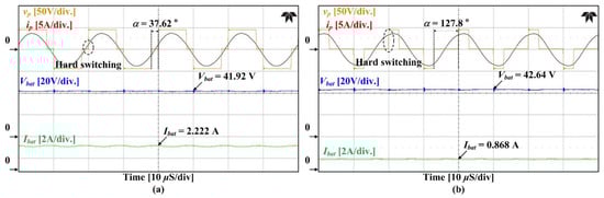 The regulation capability of the single-stage wireless battery charging circuit was tested at x = 6 cm, y = 0 cm as Figure 9a–c. When the circuit operates in fs = fo in the CC mode, Ibat was in the range of 2.32~2.358 A at 13.04 Ω < Rbat < 18.26 Ω. The variation of Ibat was 38 mA due to the effect of parasitic components as in (11). To complement this effect, the phase-shift technique was applied to the full bridge inverter. The compensated phase α was 32.58° at Rbat = 13.04 Ω and 28.8° at Rbat = 17.04 Ω as Figure 10. The regulated Ibat in the CC mode was in the range of 2.298~2.308 A (Figure 9c), and the variation of Ibat was improved from 38 mA to 10 mA owing to the phase-shift technique. When Vbat reached 42 V at Rbat = 18.26 Ω, the operational mode of the circuit was changed to CV mode. Because the circuit still operated at fs = fo, it is difficult to attain the CV characteristic regardless of Rbat as in Figure 5c. Thus, the circuit compensated α for maintaining Vbat was 37.62° at Rbat = 18.29 Ω and increased to 127.8° at Rbat = 41.53 Ω as in Figure 11. Consequently, Vbat was regulated in the range of 41.92~43 V, and variation of Vbat was 1.08 V as Figure 9b. However, the full bridge inverter operated in the hard switching condition across the whole range of Rbat as in Figure 10, and the power efficiency was measured at 86.65–60.35% in CV mode as in Figure 9d.