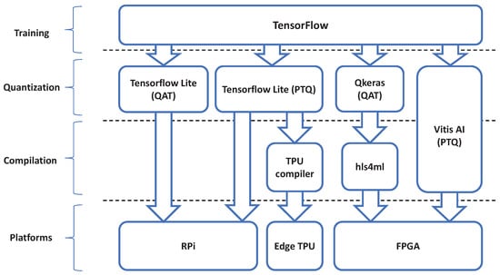 On top is the general framework for training the models, here this is TensorFlow. TensorFlow also features an extension called Tensor Flow Lite (TFLite) [12], for inference on mobile and embedded devices [12]. Depending on the embedded device, a different tool is required to embed the model. TFLite is used, for instance, for the RPi and the Coral Dev Board, while for the FPGA either Vitis AI [10] or QKeras in combination with hls4ml [9] is used. Each of these tools support optimizations to reduce the CNN model complexity while preserving the original accuracy.