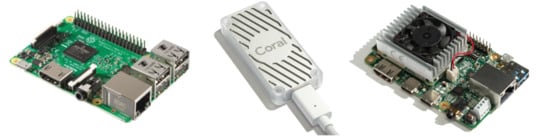 General-purpose embedded platforms and TPU-based platforms: RPi 4B (left), USB Coral TPU (center) and Coral Devboard (right).