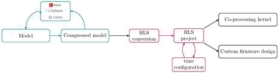 Figure 5. hls4ml tool flow as presented in [9]. - Matrix of Processing Elements: Alternative approaches based on a matrix of processing elements, more similar to GPUs and TPUs, also exist for FPGAs. An example is Vitis AI [10] from Xilinx, which uses a general purpose DPU architecture that is placed in the PL. Vitis AI has a similar tool flow to the TPU: after training, the model is quantized and compiled. Vitis AI is fully open-source [48], except for the DPU, which is provided as an encrypted IP that can be used in Vivado or Vitis to be allocated in the design. There are several different versions of the DPU depending on the FPGA used. For embedded devices, like the ZCU102 or ZCU104, there is only one DPU available: the DPUCZDX8G [49]. This is a DPU designed for general purpose CNN applications with 8-bit quantization. There are also other versions of the DPU like the DPUCADF8H, which is designed for high throughput and is supported on the U200 and U250 Alveo cards. In Section 6, the Vitis AI tool flow is used to evaluate and compare the implementation of a CNN model on an FPGA against TPU-based platforms. In this paper, Vitis AI v1.3.2, together with DPU version 1.3 and Vitis/Vivado 2020.2, are used.