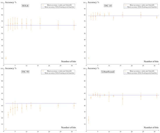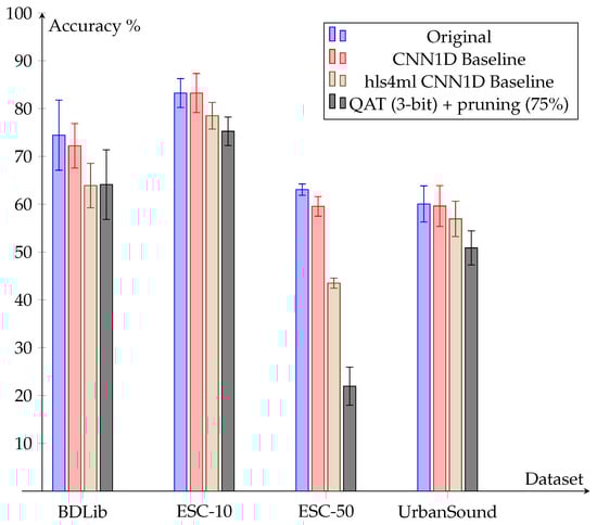 Environmental Sound Recognition (ESR), especially in urban environments, is becoming a relevant feature for many applications, from monitoring traffic in smart cities [1] and monitoring criminal activity [2], to noise disturbances monitoring in residential or natural areas [3,4], such as the noise produced by overflying airplanes taking off or landing at a nearby airport [5]. Embedded platforms are often used toward the deployment of intelligent sound monitoring devices. Several methods have been explored in the past to accurately classify urban sounds using constrained embedded devices. Among others, k-Nearest Neighbor (k-NN), Support Vector Machine (SVM), Naive Bayes and Decision Trees are machine learning algorithms that have been already evaluated [6]. Recent advances in machine learning show that Deep Neural Networks (DNN), and more specifically, Convolutional Neural Networks (CNNs), provide high accuracy for sound recognition [7]. However, they often demand computationally intensive operations, with the consequence of having a limited accuracy and slow response time when ported to embedded devices. Recording sound locally with a microphone and processing it in the cloud is not always possible nor desirable. This approach cannot only introduce privacy concerns as the communication can be intercepted by a third party, but also leads to a high latency. Moreover, power consumption is also an important factor since most embedded devices are battery powered and designed for applications with a low complexity. High speed communication protocols are power consuming, and low power communication protocols have a low throughput, hence they are not real-time. Therefore, near-sensor intelligence or embedded solutions are necessary, ideally combining the accuracy of CNNs with high inference speed and low power consumption.