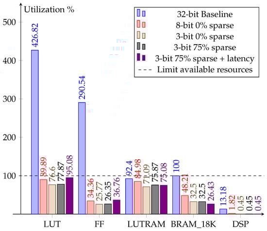 In addition to quantization, pruning, also called sparsity, helps in embedding models. Pruning reduces the size of the model by setting a predefined number of weights to zero during training [18]. After training, the multiplications involving weights that are set to zero are removed from the model. Although TFLite has an API for model pruning [43], it does not have an impact on the inference time or the size of the model on the disk. Nevertheless, hls4ml removes any multiplication involving weights that are set to zero, thus saving resources on the FPGA.