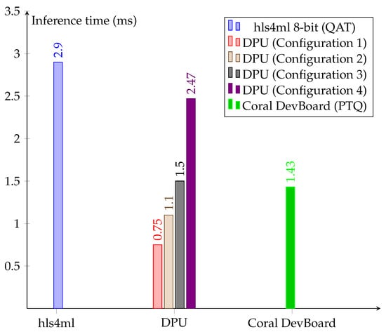 Although TensorFlow does support QAT, it still stores the model parameters as 32-bit floating point numbers. As a result, the model needs to be quantized again using TFLite after training the model. An alternative approach to this is using QKeras for QAT [19,41]. Qkeras is a framework for QAT of TensorFlow models, specifically aimed toward compressing models for hardware accelerators while providing high accuracy, low latency, and minimal energy consumption. QKeras has the advantage over standard TensorFlow quantization in that it allows more control over the number of bits used for the parameters. TensorFlow, for example, only supports 8, 16 or 32-bit fixed point numbers, where QKeras allows controlling the exact number of bits. Despite the fact that QKeras is more flexible, it is not supported on the RPi or the Coral Dev Board. These platforms only support TFLite. Hence, QKeras is only used for hls4ml and TFLite is used on the other platforms.