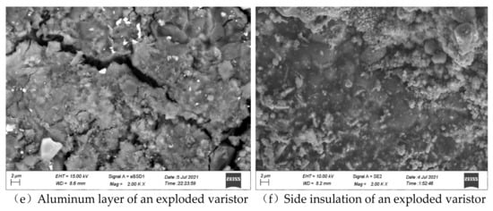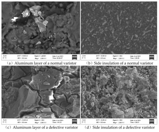 There are significant differences in the appearance of arrester varistors in normal, defective, and cracked states. In order to study the relationship between the macro and micro characteristics of varistors, the micro morphology of an aluminum electrode layer and side insulation layer of varistors in different states were tested using Scanning Electron Microscope (SEM). An Energy Dispersive Spectrometer (EDS) analyzer is used to analyze the chemical elements of the aluminum electrode layer and side insulation layer of the varistor, in different states. The SEM test results of the varistor samples in different states are shown in Figure 8, with a magnification of 2K.
