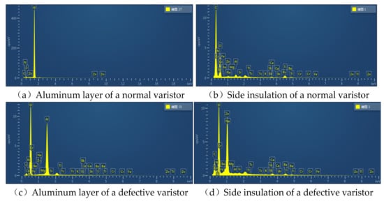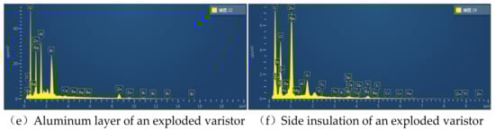 It can be seen from Figure 9 that the main element of the aluminum electrode layer of the normal arrester varistor is Al. On the contrary, a large number of O elements appear in the aluminum electrode layer of the defective and cracked arrester valve varistors. The main element in the side insulation layer of the normal arrester valve varistor is C, while the content of O in the side insulation layer of the defective and burst arrester valve varistors significantly increases. The insulating layer on the side of the burst arrester has broken down. Therefore, the Zn element inside the varistor is detected on the insulating layer. According to Figure 9c,e and Figure 8c,e, the film composition on the surface of the aluminum layer is alumina. There may be two reasons for the size difference between the alumina film and the film gap of the defective varistor and the exploded varistor: (1) With the development of the oxidation reaction, small films are connected into larger films; (2) When the exploded varistor flows through a large current, it produces a large amount of heat, and the thermal stress may increase the gap between the alumina films.