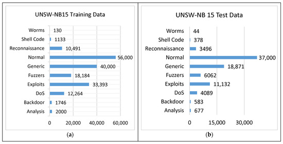 - UNSW-NB15: This is a new dataset that addresses the KDDCup 99 and NSL-KDD datasets’ problems. It was created by the Computer Security Research Team of the Australian Centre for Cyber Security (ACCS). It has the regular and attacks activities extracted by the IXIA Perfect Storm tool from a live network. Two servers were used to generate normal activities on a network, while another server was used to generate malicious activities. Tcpdump was used to collect network packet traces that compiled the network data from 100 GBs into 1000 MBs of pcaps. The pcap files were evaluated using Argus and Bro-IDS under Linux Ubuntu 14.0.3. In addition to the aforementioned methods, twelve algorithms were used to analyze the data in depth. The dataset comes in two forms: (i) full records with 2 million entries, and (ii) the data are partitioned into training and testing data. The training data consist of 82,332 records, whereas the testing data comprise 175,341 records, with 10 attacks included. The partitioned dataset includes 42 features and their classes are labeled as Normal and 9 different attacks. The detailed dataset statistics are given in Figure 7.