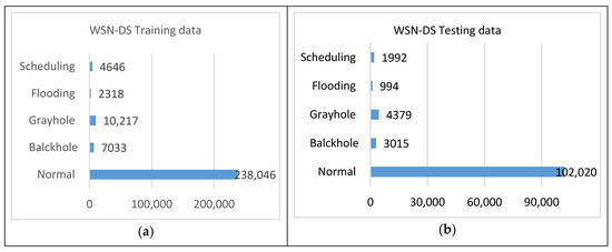 - WSN-DS: This is an IDS dataset for WSNs which includes four types of DoS attacks: Blackhole, Grayhole, Flooding, and Scheduling. The data were collected using the LEACH technique, a low-energy adaptive clustering hierarchy protocol, then processed to generate 23 features. The dataset statistics are presented in Figure 8.