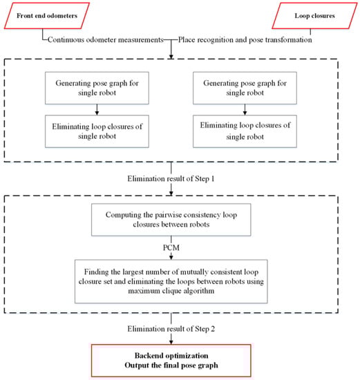 In this paper, the false positive loop-closure detection and pose optimization algorithm in a multi-robot SLAM system is divided into two stages by using the above test results based on consistency checking: (1) reject the false positive loop closure for each individual robot in the first stage; (2) reject the false positive loop closure between cooperative robots using the results of the first step. Figure 3 shows a flow chart of this algorithm.