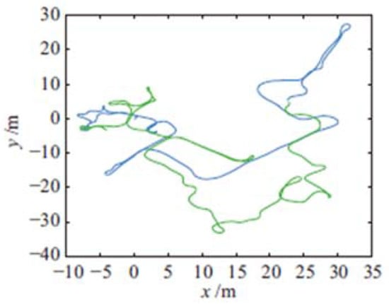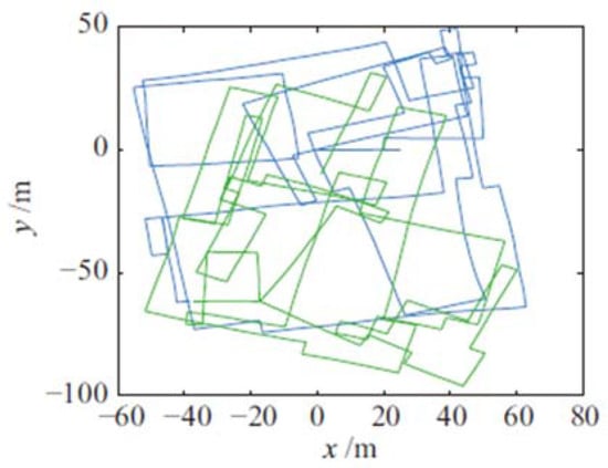 Trajectories of the original CSAIL dataset after cutting, and the solid green line and solid blue line in the figure represent the odometer measurement of the two robots respectively.