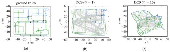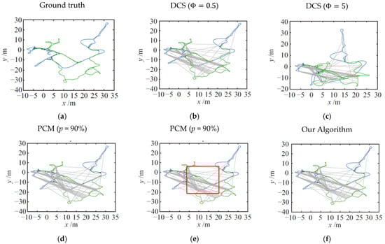 As shown in Figure 8b, even with the optimal parameter setting, the positional fusion results of DCS () are still with large error, and in the red box of Figure 8e, the PCM algorithm still has a large gap in the accuracy of the fused poses since no false-positive loop closure is rejected for an individual robot.