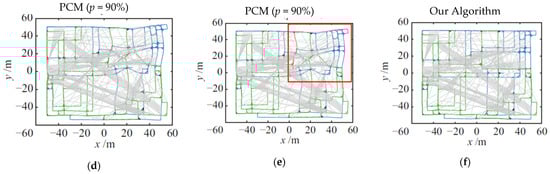 Comparison of pose fusion results on CSAIL dataset. (a) Ground truth of CSAIL data set; (b) Optimization result using DCS algorithm with ; (c) Optimization result using DCS algorithm with ; (d) Optimization result using PCM algorithm with p = 90%; (e) Optimization result using PCM algorithm with p = 90%, the red box indicates the difference from ground truth; and (f) Optimization result using our algorithm.