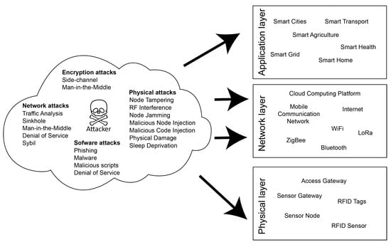 In Figure 1, we summarize the attack types that can be used by the attacker on various layers of IoT solution. In a specific security modeling, the IoT builders need to map possible attacks to their IoT architecture and assign appropriate risks according to asset and attacker models. The attack-type features in Figure 1 are described in more details in the rest of this section. Note that when modeling attackers and their capabilities, we should consider all parts of an IoT solution, including all parts of the solution on the physical layer, network layer, and application layer. Attackers try to target the weakest part of the system. A security breach on one layer can undermine potential defenses on other layers; thus, it is also necessary to include crosslayer security in the security model.