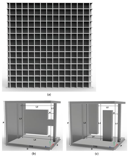 (a): Array 14 × 14 square waveguides. (b): Unit-cell type with a C-shaped resonator on the wall and dimensions. (c): Unit-cell type with an S-shaped resonator on the wall and dimensions. The length of the slot perforation is calculated as .