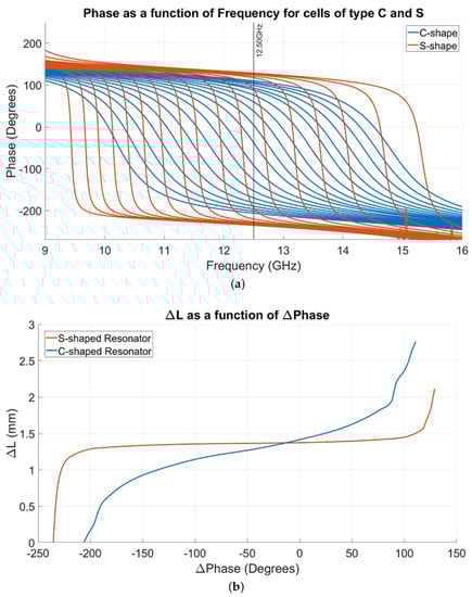 Figure 2a illustrates the phase variation as a function of frequency for C- and S-shaped resonators. The curves were obtained using the electromagnetic solver CST. Different curves, each associated with a particular geometry of the resonators, are appreciated. The first graphical difference that we observe corresponds to the slope of the curves of both resonators, being much greater for the S-shaped resonator, which implies a greater phase change in a smaller range of frequencies.