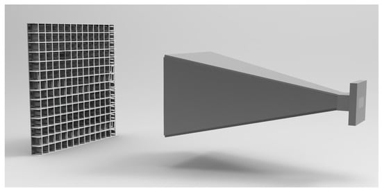 The structure under consideration in the present manuscript is a Frequency Selective Surface (FSS) based on a full-metal design. As shown in Figure 1a, it consists of a two-dimensional arrangement of classical square waveguides (cells). This type of architecture was previously reported in [29,36], functioning as polarizers and pass-band prototypes. The dimensions of the cells are such that no propagating modes are excited at the operation frequency ( with being the wavelength in vacuum). Instead, only evanescent modes will be present inside the cell. A ground plane is placed at the bottom of the cell, in order to force full-reflection response.