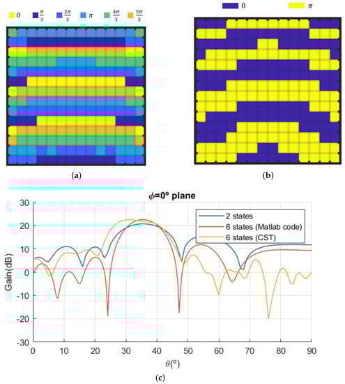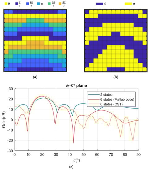 (a): Phase arrangement considering six states. (b): Phase arrangement considering two states. (c): Radiation pattern, beam direction: (,) = (0,20).