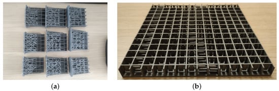Since the dimensions of the entire RA are larger than recommended by the 3D printer, it was split and printed in nine individual pieces. Each of these individual pieces consisted of arrangements of 3 × 3 or 4 × 4 cells. Additional supports were needed in order to guarantee the self-robustness of the pieces during the fabrication process. Figure 6a shows the nine pieces including the supports, which are essentially very narrow dielectric bars. When the piece is completed, it is centrifuged and sunk in isopropyl alcohol in order to avoid resin remnants. It is also cured with ultraviolet light to completely fix the resin.