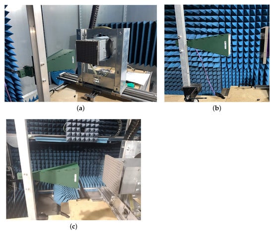 The structure was mounted in its setup with the feeder located at the defined distance of cm and measured at the mmWave antenna measuring facility of the SWAT Group at the University of Granada. The RA setup can be seen in Figure 7a,b, while the measuring setup in the measuring system is depicted in Figure 7c. The prototype is finally characterized in terms of its radiation pattern in the vertical plane. The pattern measurement is shown in Figure 8, having the center working frequency at 12.7 GHz. This yields a frequency shift of 0.2 GHz with respect to the theoretical results.