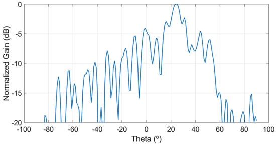 We can observe, in Figure 4b and Figure 5b, the 14 × 14 phase-panel obtained for this case. As expected, the RA gained in simplicity. It is worth remarking that the phase evolution follows a similar tendency in both cases, simulating a sort of partial rings. The phase diversity is, as expected, richer in the six-state case. The simplicity of the one-bit RA is manifested in the results plotted in a blue curve in Figure 4c and Figure 5c. However, the gain decreases down to 20.8 and 20.7 dB, whereas the SLL increases up to 15.5 and 15.4 dB, respectively.