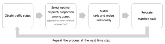 With accurate GPS receivers and fast wireless communication interfaces, traditional taxi management systems are transforming to become more efficient and profitable [11]. Previous works recommend that drivers pass through the routes where potential passengers might exist [12] or travel to high-demand spots [13]. Most recent ride-hailing platforms either match a driver to the closest passenger call [8,9,10] or use queueing strategies for first-come-first-served dispatching [6,7]. Zhou et al. proposed a model which dispatches taxis in such a way that demands and supplies are balanced based on demand prediction [3]. Furthermore, Xu et al. used a recurrent neural network (RNN) and captured complex spatio-temporal features to predict taxi demand [14]. Yang et al. studied the demand and supply equilibrium of taxi services regulating the fare system and fleet size [15]. Conventionally, automated taxi dispatching systems try to minimize passenger wait time and taxi idle time or match the closest vacant taxi to a given order [9,10,16,17]. Zhang et al. used the combinatorial optimization [18] technique to improve the probability of successful matching [19]. Park et al. exploit the optimal price to match taxis with passengers and simultaneously maximize cumulative revenue [5]. Similarly, Zheng et al. studied optimal pricing [20], and Zhao et al. analyzed passengers’ preferences [21].