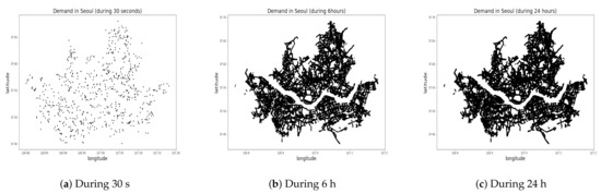 Existing works divide the service region into a grid of rectangular or hexagonal cells [2,3,30] or cluster high passenger demand spots [4,5] using algorithms such as K-means clustering [31] or the density-based spatial clustering of applications with noise (DBSCAN) algorithms [32,33]. No meaningful cluster can be identified if spots are scattered uniformly all across the region, as shown in the distribution of passenger calls during 30 s, 10 min, 24 h in Seoul, South Korea (Figure 3). No more than two clusters are detected around the Han River in the middle of the area. In this work, we chose to divide the service region into 2 to 25 administrative divisions (zones) as shown in Figure 4, which is similar to the grid-based approaches implemented in [2,3,30]. We model the fleet management method that ignores the divisions and matches passenger calls with vacant taxis on a point-to-point basis.