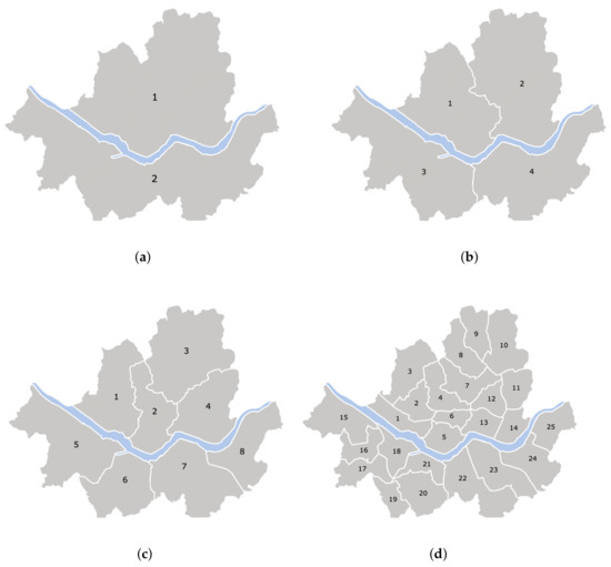 Seoul is divided into (a) 2, (b) 4, (c) 8, and (d) 25 zones. The matching process occurs independently within each zone.