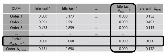 Once the computation according to Equation (6) is completed for all rows, we execute Algorithm 1 to retrieve matched pairs of passengers and taxis. We find the highest in , and we mark the ith passenger and the jth taxi as matched. Then, we cross them out by setting every term of both and to zero as shown in Figure 5. In the next iteration, the jth taxi is not redundantly considered to match other passengers, even though the initial computation result shows that the jth taxi matches with another passenger with the highest value of all other taxis. We repeat this iteration until becomes free of non-zero values. Removing the taxi from consideration immediately upon matching helps with the expedition of the algorithm as well. Matching based on CMM is the basis for other dispatch decision methods, as presented below.