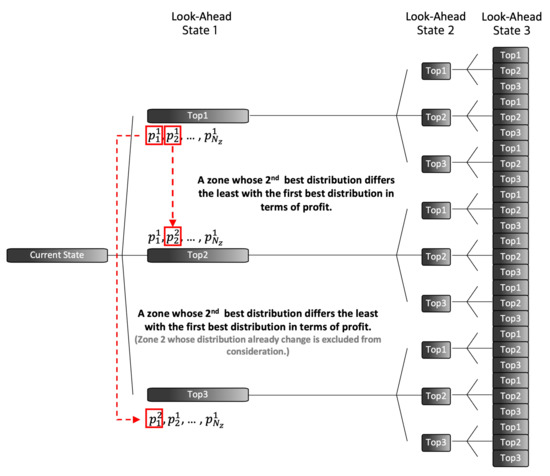 In every look-ahead state, M-Greedy chooses the top-k distributions that yield the highest revenue and profit. In this figure, each block represents a top-k case after simulating all cases in the preceding state. Then, the platform looks ahead D time steps in the future. As a result, M-Greedy chooses the best case among cases once the computation is finished on the last look-ahead state. In this paper, we set k to 3 and D to 3.