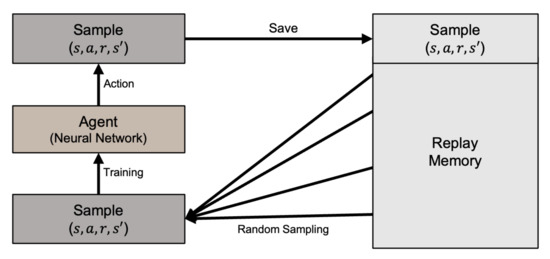 With Q-learning, the state–action combinations are stored in a table [35]. However, the Q-learning table cannot store the increasing number of continuous state variable values generated by our problem. Instead, we use the Deep Q-Learning method (DQN) with a deep neural network to approximate the Q function [24,29]. To resolve the issue of instability when a neural network attempts to approximate a non-linear function, DQN uses experience replay to randomly sample past actions instead of the most recent actions to proceed. DQN with the experience replay prevents the reinforcement learning from becoming excessively divergent due to a small update to Q. The DQN architecture is illustrated in Figure 7.