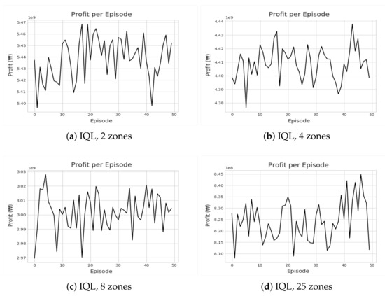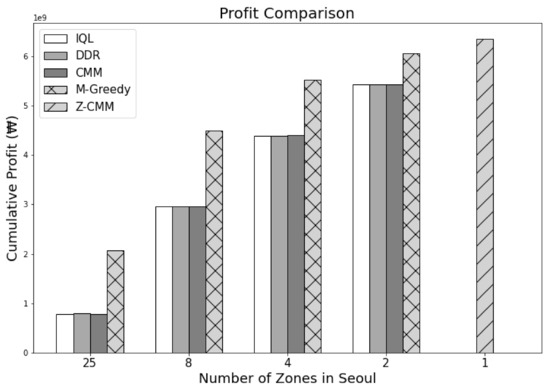 Figure 8 and Figure 9 show the cumulative profit during the reinforcement learning (RL) through IQL and DDR. Despite multiple iterations of reinforcement learning, we can see that the profit is highly divergent. In other words, no apparent profitable policy could be learned. Even accounting for the future states, approaches based on reinforcement learning could not outperform greedy approaches in terms of revenue and profit as shown in Figure 10 and Figure 11. Most interestingly, Z-CMM, which is not restricted by the service area divisions, yielded the highest revenue and profit compared to other approaches. Z-CMM generated 4.647 % and 4.982 % higher revenue and profit on average (equivalent to 0.3 billion Korean won and 0.28 billion Korean won more in revenue and profit), respectively, than the best zone-sensitive approach in the two-zone setting.